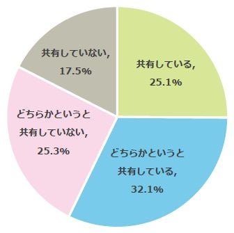 災害時の避難場所について、子どもと共有しているか質問したところ、57.2%が「共有している」(共有している:25.1%、どちらかというと共有している:32.1%)、42.8%が「共有していない」(共有していない:17.5%、どちらかというと共有していない:25.3%)と回答しました。