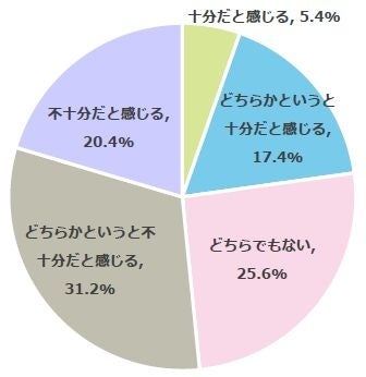 現状のご家庭での防災対策で十分だと感じているか質問したところ、22.8%が「十分だと感じる」(十分だと感じる:5.4%、どちらかというと十分だと感じる:17.4%)、51.6%が「不十分だと感じる」(不十分だと感じる:20.4%、どちらかというと不十分だと感じる:31.2%)と回答しました。