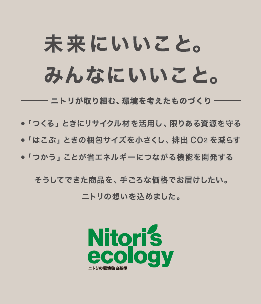 わたしたちニトリグループは、「未来にいいこと。みんなにいいこと。」のキャッチフレーズのもと、「つくる・ はこぶ・つかう」それぞれのフェーズで、環境に配慮したものづくりを「Nitori’s ecology」と位置付け、取り組みを進めています。さらに「つかいおわったあと」までを考え、企画・設計段階から資源の有効活用を見据えた商品開発や、回収して資源にまわせる製品の拡大を目指しています。