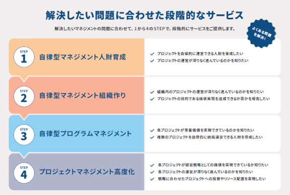 プロジェクトマネジメントの専門会社として積み上げてきた成功事例をもとに、お客様の組織のマネジメント課題に合わせ、プロジェクトマネジメント支援、研修、ツールを組み合わせたパターンで組織が自律できる仕組みをご提案します。