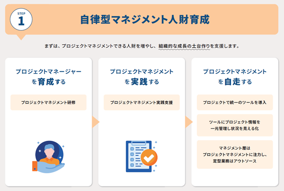 まず、トレーニングによりプロジェクトマネジメントできる人財を育成し、育った人材が実際にプロジェクトでマネジメントを行う際は当社がサポートしながら実践支援します。その後は、ツールを用いてプロジェクト状況を見える化し、お客様がプロジェクトマネジメントを自走できる仕組みを作ります。