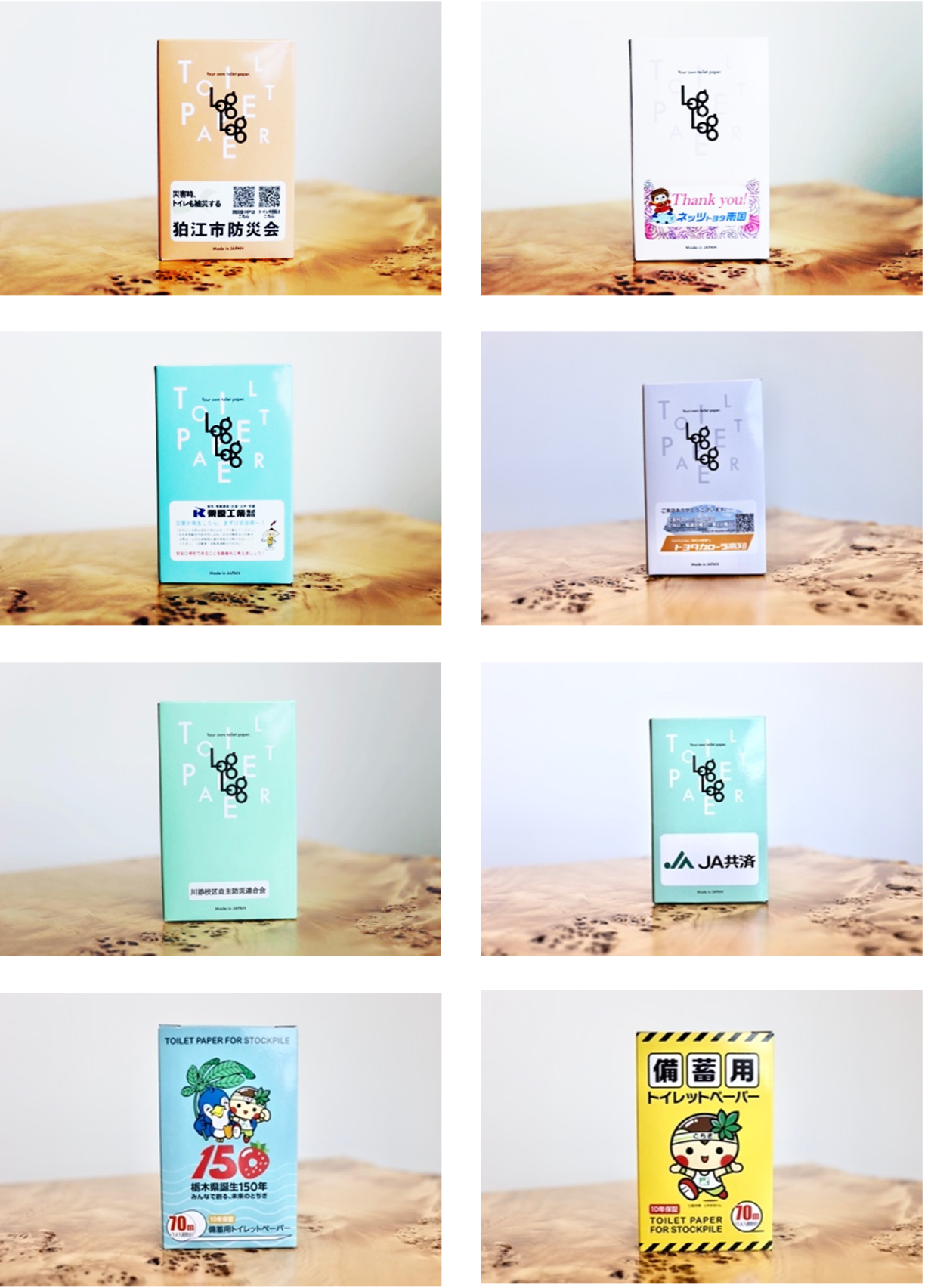 LogLogは2022年10月に発売して以降、既に多くの自治体・企業へ納品しています。使用用途として、備蓄用はもちろん、防災の日(9月1日)に合わせた自治体の防災イベントノベルティ、一般企業においては、ご来店の御礼ノベルティや年始挨拶回り用の粗品等、さまざまです。LogLog既製箱のままでの納品はもちろん、添付画像のようにオリジナルラベルシールを貼付し企業名・自治体名を名入れすることが可能です。またオリジナルBOXとして、5面(天面側面)にフルオリジナルデザイン仕様とすることもできます。