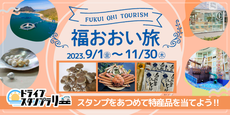 JAF(一般社団法人日本自動車連盟)福井支部(支部長 福田 竜一)は、9月1日(金)から開催されるドライブスタンプラリー企画「福おおい旅」(主催:一般社団法人おおい町観光協会)に協力します。秋の行楽シーズンに向けて、福井県大飯郡おおい町の魅力を再発見しながら周遊いただけます。