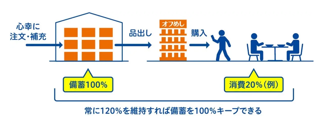 例えば、備蓄用(100%)と消費用(20%)の「オフめし常温そうざい」を注文。普段は消費用の惣菜をおいしく食べて、減ったら備蓄用の惣菜から補充します。減った分は新たに注文して備蓄用としてストック。常に120%のストックを維持すれば備蓄を100%キープできます。また、備蓄用の食品がいつも最新の賞味期限のものとなるため、いざ災害が起きた際にも、賞味期限切れということがありません。「食べながらそなえる、新しい備蓄プラン」それが、「オフめしイート&ストック」です。