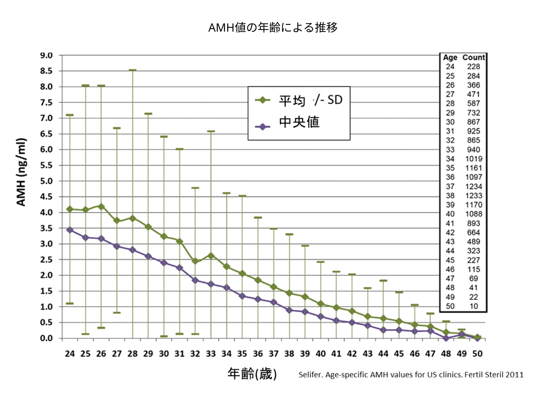 AMH検査とは、少量の血液の採取で卵子の周りの細胞から出るホルモンであるAMH(アンチミューラリアンホルモン)の値を測ることにより、身体に残された卵子の数の目安を知ることができる検査です。卵子は特殊な細胞で、皮膚や臓器など、人間の一般的な細胞が日々細胞分裂を繰り返して生まれ変わるのに対し、 卵子の元となる卵細胞は新しく生まれず、卵巣の中の卵子の個数は減少し続けます。卵子が減少するスピードには、個人差がとても大きいことが分かっており、現代の日本人女性の閉経は50歳前後が平均ですが、100人に2~3人は30代で閉経してしまうと言われています。この早発閉経の兆候も、AMH検査で簡単に知ることができます。