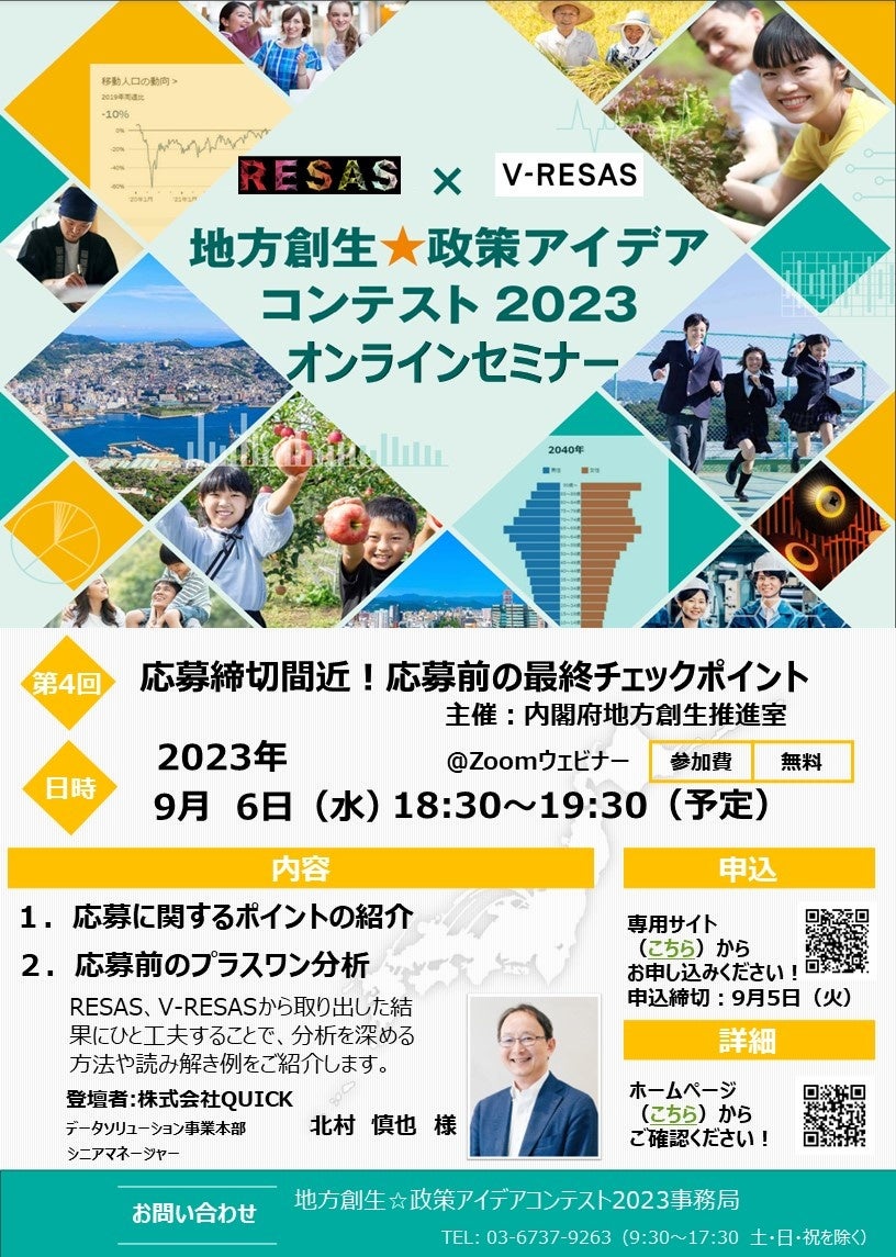 内閣府地方創生推進室では、「地方創生☆政策アイデアコンテスト2023」に向け、オンライン(Zoomウェビナー)にて、RESAS×V-RESAS 地方創生☆政策アイデアコンテスト2023 オンラインセミナー 第4回を開催いたします。