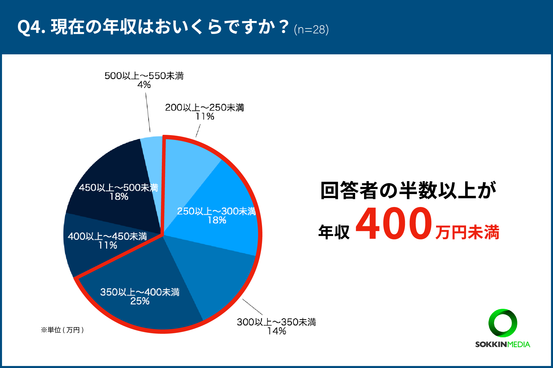 「Q4.現在の年収はおいくらですか?」という問いに対して、回答者の半数以上が年収400万円未満という結果となりました。年収にはばらつきが見られ、250万円未満と答えた方が11%いる一方で、450万円以上と答えた方が22%いました。