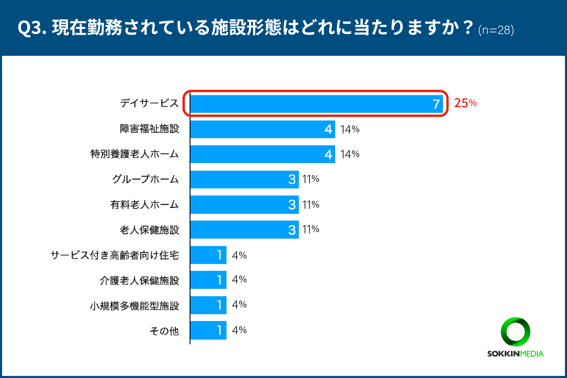 「Q3.現在勤務されている施設形態はどれに当たりますか?」という問いに対して、「デイサービス」と答えた人が最も多く全体の25%を占めました。次いで「障害福祉施設」「特別養護老人ホーム」がそれぞれ14%となっています。