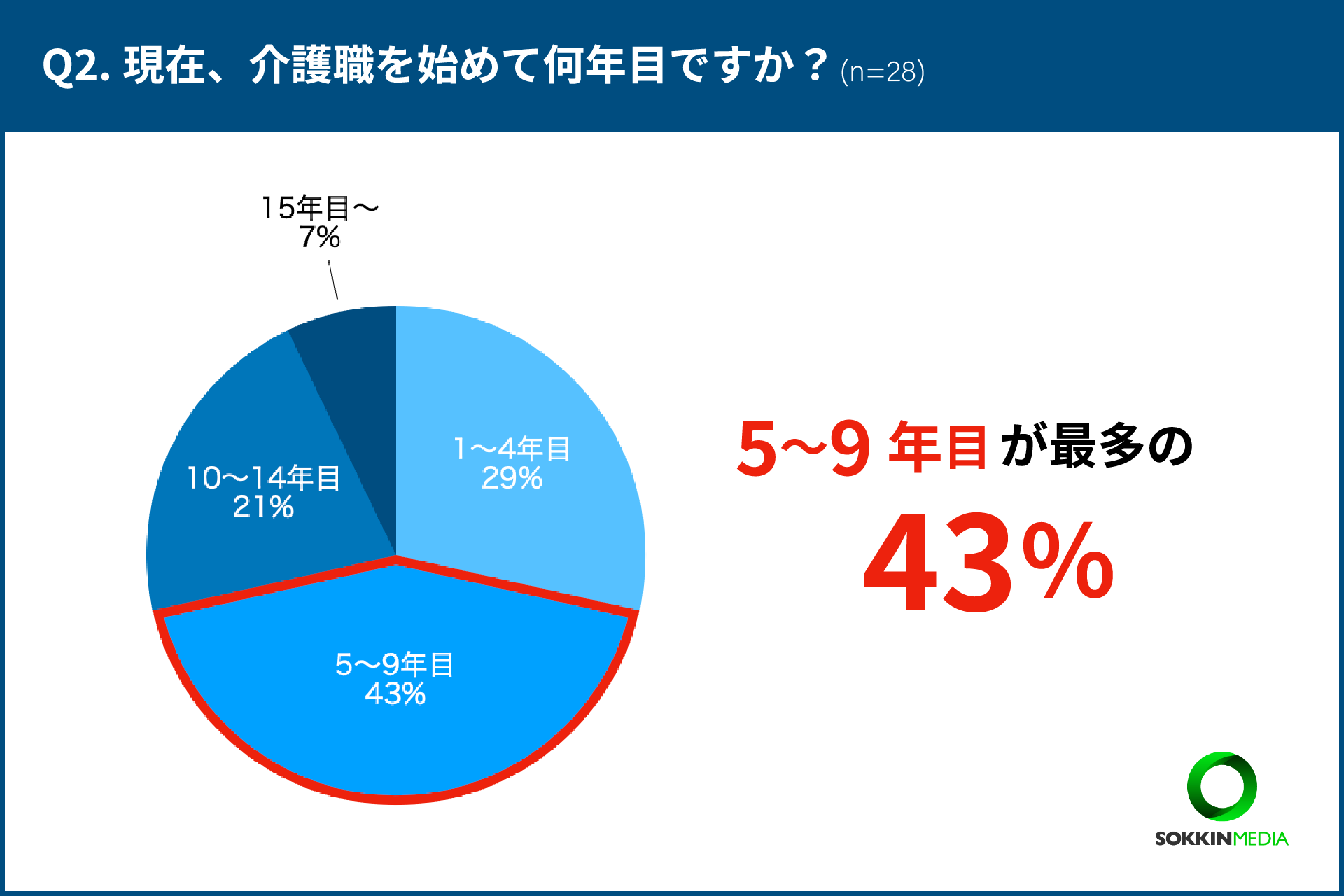 「Q2.現在、介護職を始めて何年目ですか?」という問いに対して、「5〜9年目」という人が最も多く全体の43%を占めました。次いで「1〜4年目」が29%となっています。中堅の介護士の方が回答者の半数近くを占めていることがわかります。