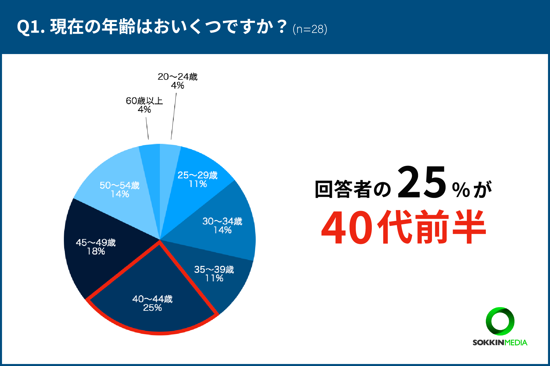 「Q1.現在の年齢はおいくつですか?」という問いに対して、「40〜44歳」という人が最も多く全体の25%を占めました。次いで「45〜49歳」18%となっています。年齢層は比較的満遍なく分布していました。
