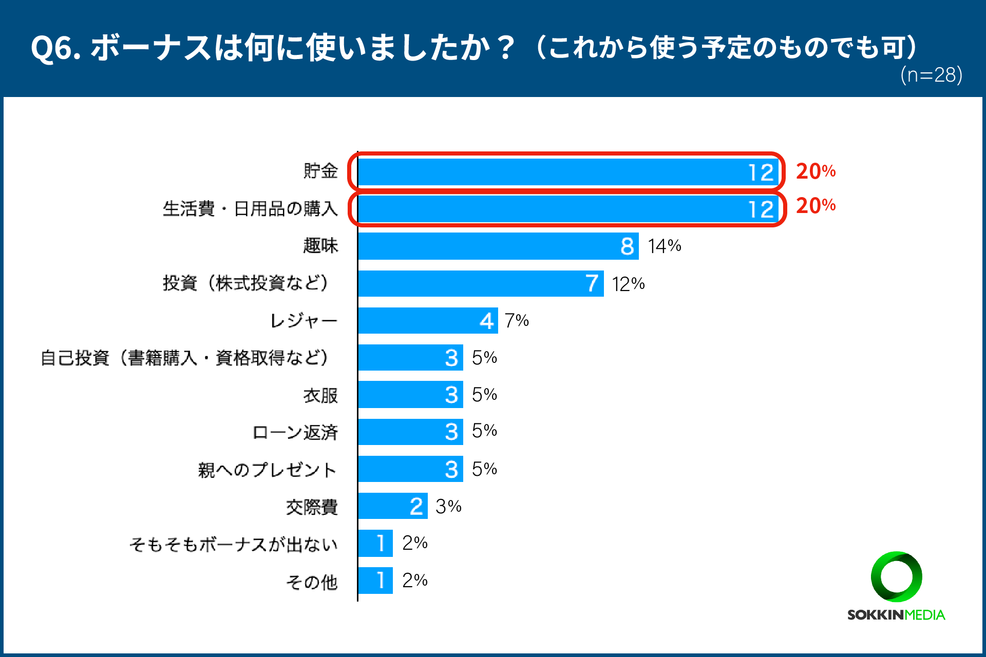 「Q6.ボーナスは何に使いましたか?(これから使うものでも可)(複数選択可)」という問いに対して、「貯金」と「生活費・日用品の購入」と答えた方が最も多くそれぞれ20%という結果になりました。次いで、「趣味」が14%となりました。