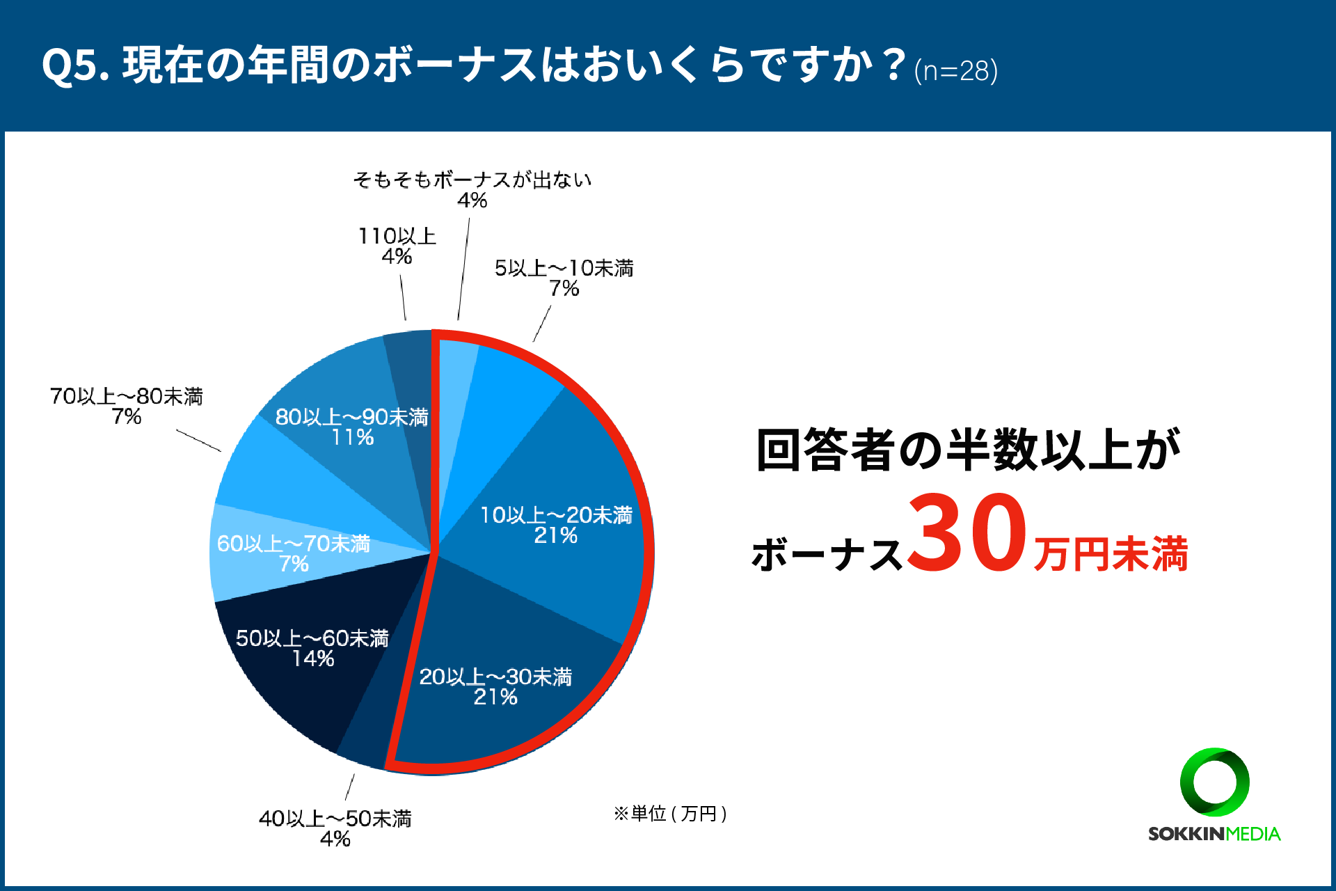 「Q5.現在の年間のボーナスはおいくらですか?」という問いに対して、回答者の半数以上がボーナス30万円未満という結果になりました。ボーナスにもばらつきが見られ、10万円未満と答えた方が11%いる一方で、80万円以上と答えた方は15%いました。