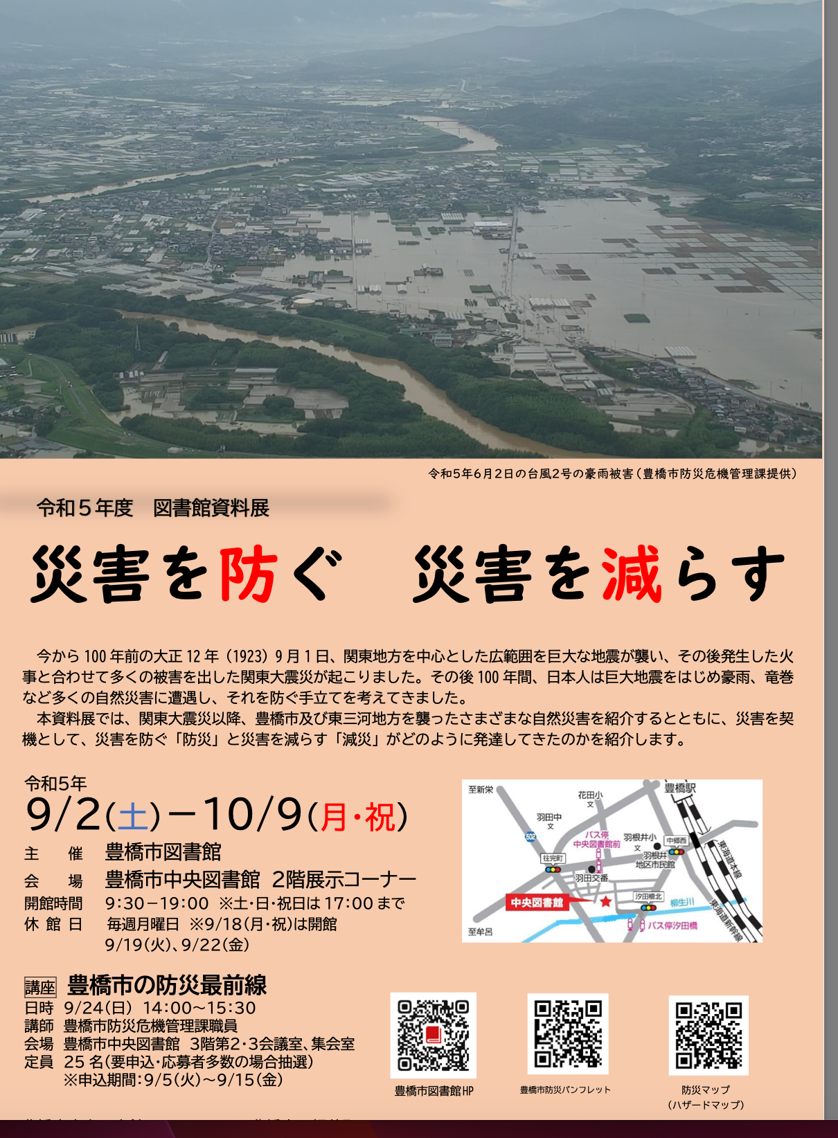 6月に豪雨に見舞われ、大きな被害を受けた豊橋市。自然災害への関心が高まっている今、防災と減災の歴史だけでなく、最新情報も学べる資料展で災害への備えを改めて考えてみてはいかがでしょうか。