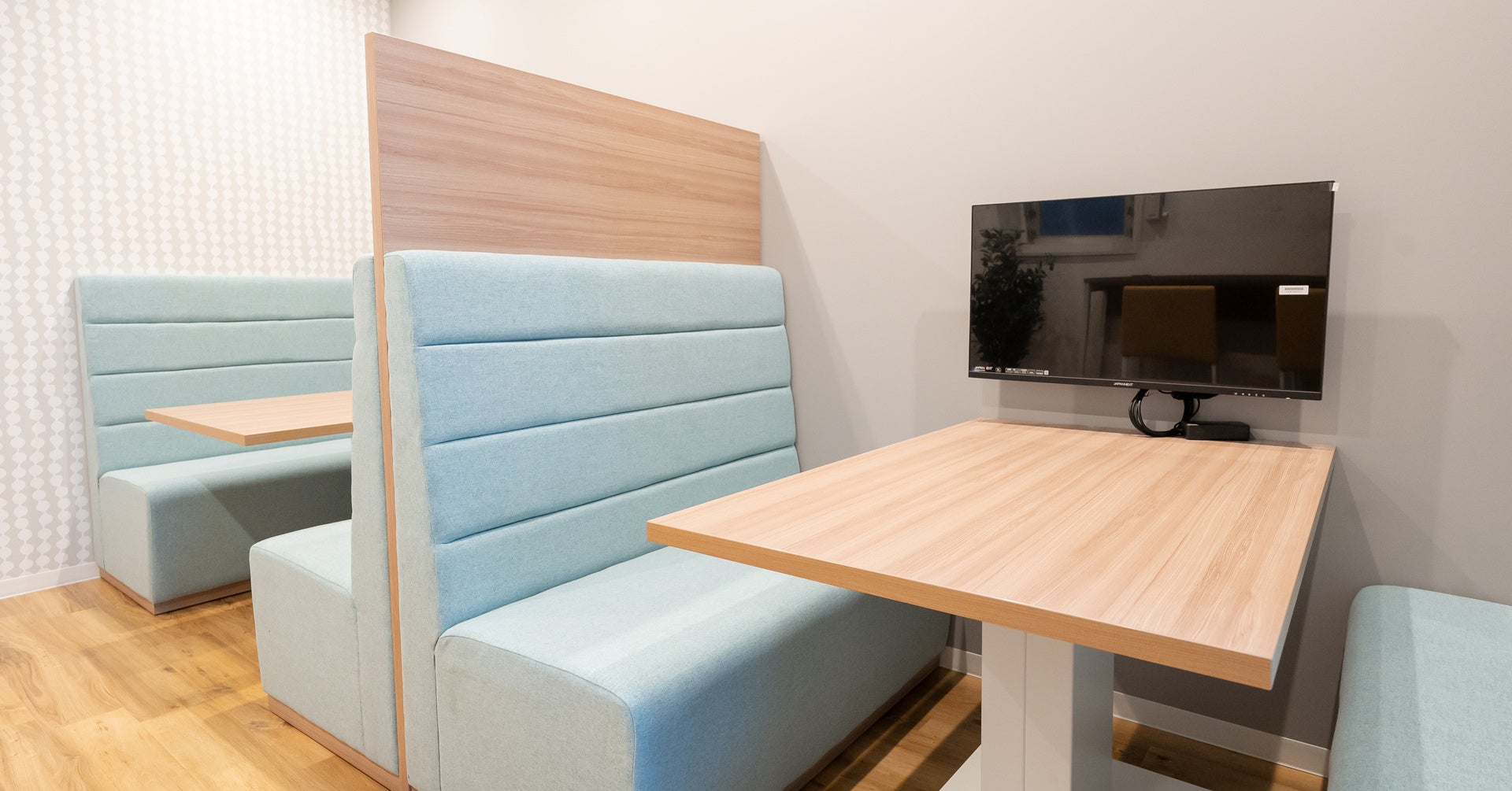 リフレッシュスペースをあえて独立させ、背の高いソファでほどよい個室感を感じられる空間は、休憩時に周り