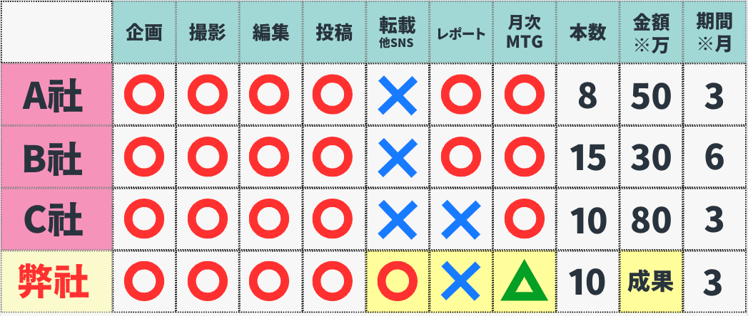前述のように、成果報酬型のTikTok運用代行プランでは、今までクライアント様が背負っていたリスクを、弊社が背負うこととなります。ですので、弊社は確実にTikTok運用で成果を残す必要があります。