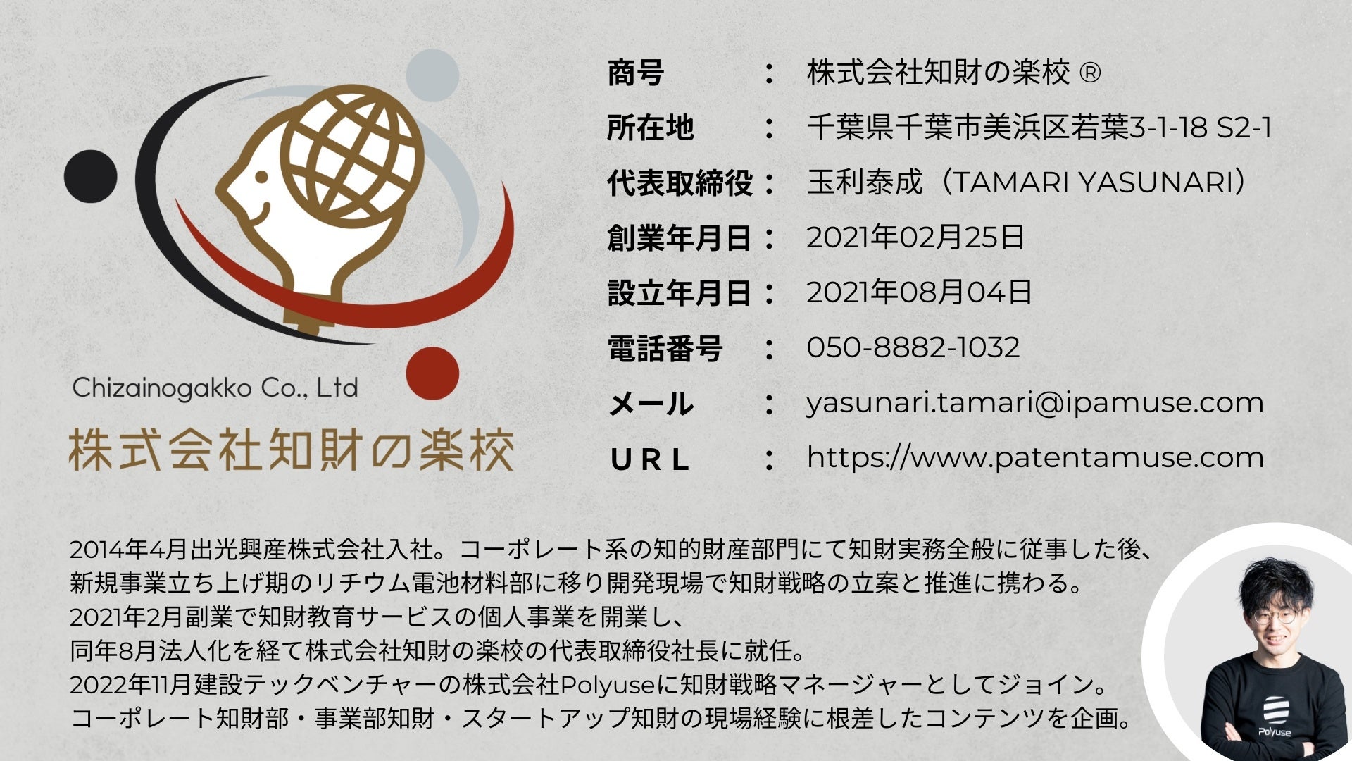 知財の楽校で代表をしております玉利泰成と申します。私は2014年に新卒で出光興産に入社し、最初の5年間はコーポレート系の知的財産部門で知財実務全般に従事してから、新規事業立ち上げ期のリチウム電池材料部門に籍を移し、開発現場で知財戦略の立案と推進、各種知財管理体制づくりに携わりました。在籍中の2021年2月に副業で知財教育サービスの個人事業を開業し、半年後の8月に法人成りして創業した会社が知財の楽校です。その後、出光興産を退職し、現在は建設テックベンチャーのPolyuseというスタートアップで知財責任者として働いています。