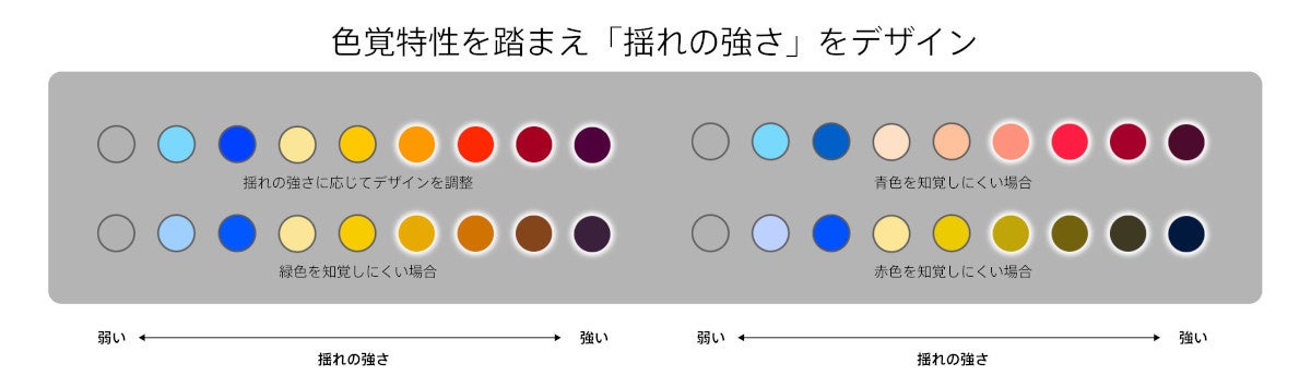 「TBS NEWS DIG」アプリの強震モニタレイヤーでは、大きな地震で強く揺れた場所を強調し、また揺れが小さかった場所は目立ち過ぎないようにデザインしています。1秒を争う状況でこそ、様々な色覚特性をお持ちのユーザー1人1人に、地震の広がりを直感的に伝えられるようカラーユニバーサルデザインを意識しています。