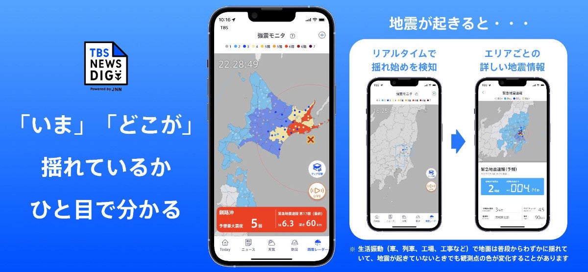 TBSテレビをキー局とするJNN28局のニュースメディア「TBS NEWS DIG Powered by JNN」は、関東大震災の発災から100年にあたる2023年9月1日にアプリの防災機能を大幅にアップデートしました。今回のアップデートで「いま」「どこが」「どれだけ」揺れているか、リアルタイム震度(※1)で表示する機能(強震モニタレイヤー)を新たにご利用いただけるようになります(※2)。この機能は、過去に報道機関のサービスに搭載されたことはなく、今回の「TBS NEWS DIG」アプリへの実装が初めてのケースとなります。強震モニタレイヤーでは、日本全国の今の揺れが地図上にリアルタイムで表示されるため、地震の発生から揺れが広がる様子を直感的に捉えることができます。地震が起きたときに「どこが」「どれだけ」揺れているかを瞬時に伝え、「何が」起きているかをいち早く報道することで、ユーザーの「命を守る」行動をサポートします。