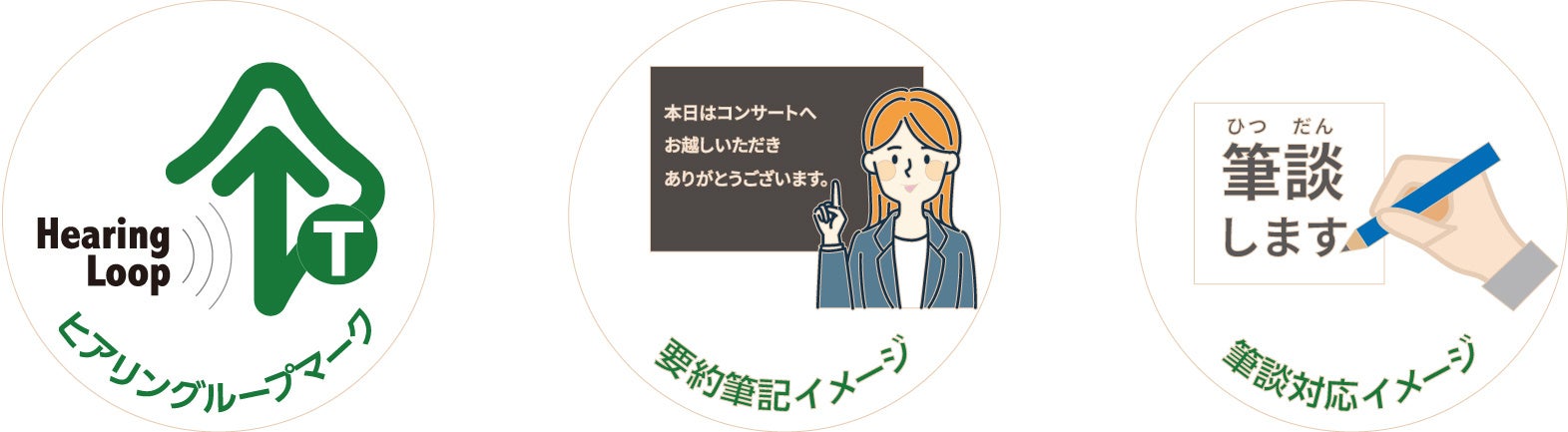 当日は補聴器を装用したまま演奏をお楽しみいただけるよう、磁気を通して補聴器に音を届け、雑音の少ないクリアな音声を届ける「磁気ループシステム(テレコイル)」、話し手の内容を要約して字幕で伝える「要約筆記」をそれぞれ導入、また「筆談」対応可能なスタッフを配置することで補聴器使用者をはじめ、聴覚障害のある方に対する情報保障を行います。
