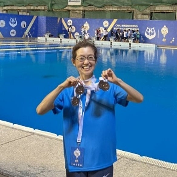 イルカと泳ぎたいと思い、16年前から始めたフィンスイミングを59歳になった現在も精力的に活動されています。「ワールドカップマスターズ大会でのメダル獲得」を夢に財団に応募。第1期・2期と継続的に財団の支援を受けながらトレーニングを続けられ、今年ついにカイロで開催された世界大会への出場を果たしました。本大会では見事、銅メダルを4つ獲得し、夢を叶えました。