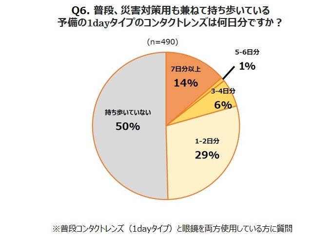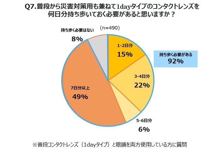 1dayコンタクトレンズ使用者の内、50%が予備のコンタクトレンズを『持ち歩いていない』。一方で92%が普段から予備のコンタクトレンズを『持ち歩く必要がある』と考えている。さらに49%は『7日分以上必要』と回答。