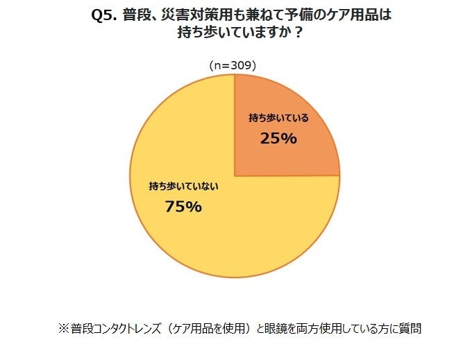 また、災害対策用も兼ねて予備のコンタクトレンズケア用品を持ち歩いているかについては、『持ち歩いていない』と回答した従業員が75%となり、『持ち歩いている』従業員は25%に留まりました。