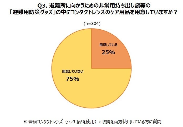コンタクトレンズケア用品を「避難用防災グッズ」に用意しているのかについて、『用意している』は25%、『用意していない』が75%と、コンタクトレンズケア用品に関する防災意識は顕著に低い傾向であることが分かりました。