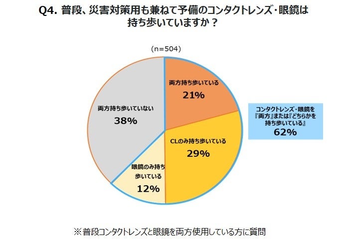 コンタクトレンズと眼鏡を併用している従業員の、災害対策用も兼ねた予備のコンタクトレンズ・眼鏡の持ち歩き状況は、『両方持ち歩いている』が21%、『コンタクトレンズのみ持ち歩いている』が29%、『眼鏡のみ持ち歩いている』が12%であることに対して、『両方持ち歩いていない』が38%という結果となりました。約6割の従業員がコンタクトレンズ・眼鏡の『両方』またはどちらかを『持ち歩いている』一方、約4割が『両方とも持ち歩いていない』ことが分かりました。