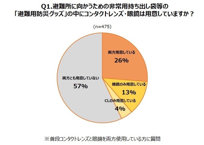 避難所に向かうための非常用持ち出し袋等の「避難用防災グッズ」の中に、コンタクトレンズ・眼鏡を『両方とも用意していない』が半数を超え57%