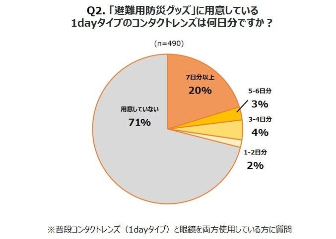 また1dayタイプのコンタクトレンズを使用している従業員に対する、「避難用防災グッズ」に用意している1dayコンタクトレンズは何日分かの問いに対しては、20%が『7日分以上用意している』と回答したものの、やはり『用意していない』が最多の71%となりました。