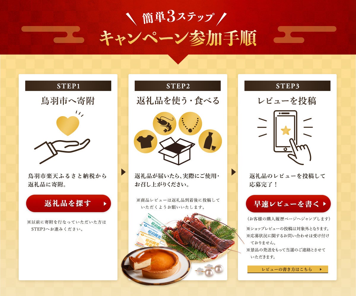 指定期間中に鳥羽市楽天ふるさと納税にて商品レビューをご投稿いただいた方が対象です。