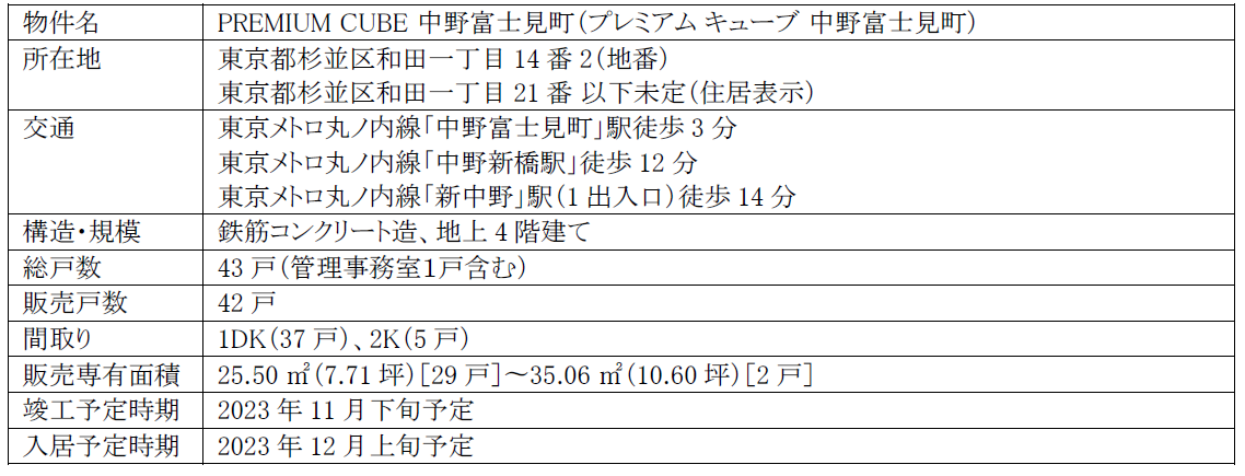 不動産 DX を推進する株式会社アンビション DX ホールディングス(証券コード「3300」、本社:東京都渋谷区、代表取締役社長 清水 剛、以下「当社」)の子会社で、新築投資用デザイナーズマンションの開発を手掛ける株式会社ヴェリタス・インベストメント(以下「ヴェリタス」)は、『PREMIUM CUBE 中野富士見町』(東京都杉並区、竣工予定日:2023年11月下旬、入居予定日:2023年12月上旬)につきまして、販売を開始しました。