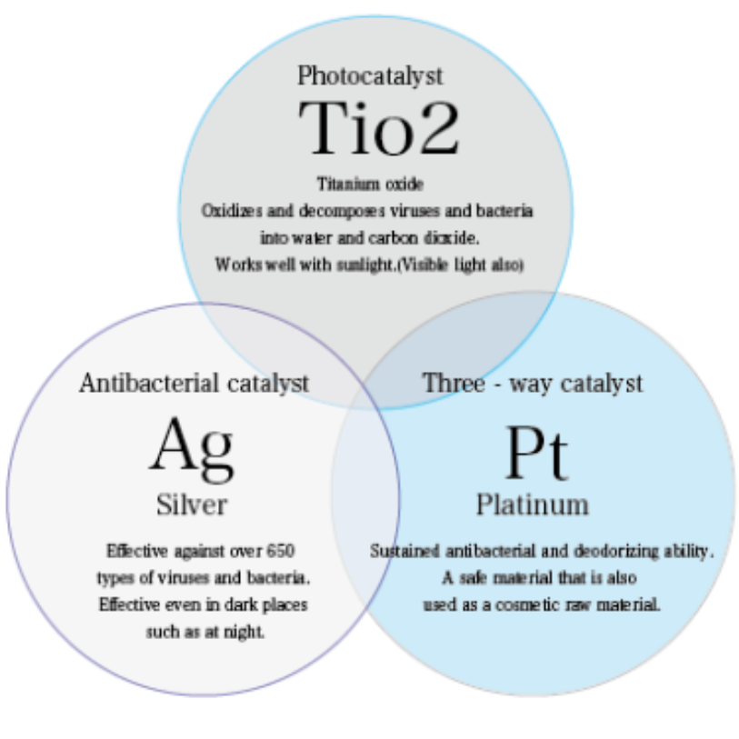 3種の触媒を組み合わせることにより、触媒反応を加速・強化することが可能です。3種の触媒とは、プラチナコロイド・銀コロイド・酸化チタンを主成分とした抗菌・抗ウイルス・消臭剤です。空間全体を飽和状態にさせ、まんべんに触媒を定着させることにより有機物を不活化させます。