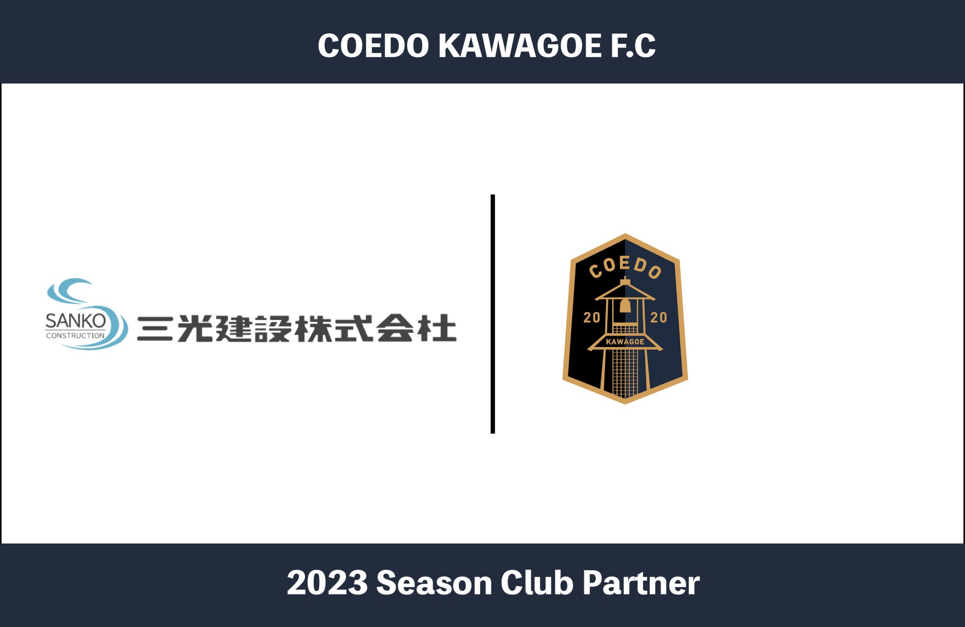 COEDO KAWAGOE F.Cを運営するCOEDO KAWAGOE F.C株式会社(埼玉県川越市、代表取締役 有田和生)は、短工期・低価格・高強度のYessシステム建築で、倉庫・店舗・工場・駐車場等のあらゆる規模の建築に対応する三光建設株式会社(埼玉県川越市、代表取締役 栗原雄一)と2023シーズンのクラブパートナー契約を締結したことを発表いたします。