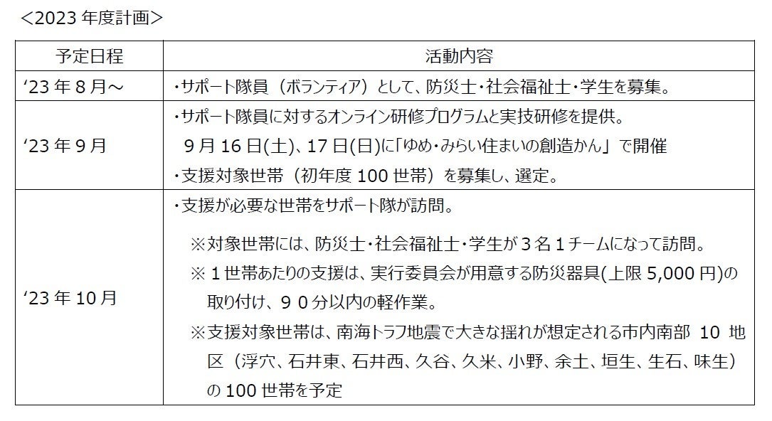 「新たな備えサポート隊in 松⼭」実⾏委員会は、⺠間が中⼼となって組織を⽴ち上げ、産官学⺠協働で地域の防災強化に臨む取り組みは全国でも初めての試みとして2022 年7 ⽉に発⾜しました。昨年度はコロナ禍での活動ではありましたが、松⼭市内の56世帯を訪問し、「新たな備え」の普及に努めました。今年度は南海トラフ地震で⼤きな揺れが想定される松⼭市南部10 地区、100世帯へ「誰ひとり取り残されない災害対応」をめざした活動を展開いたします。