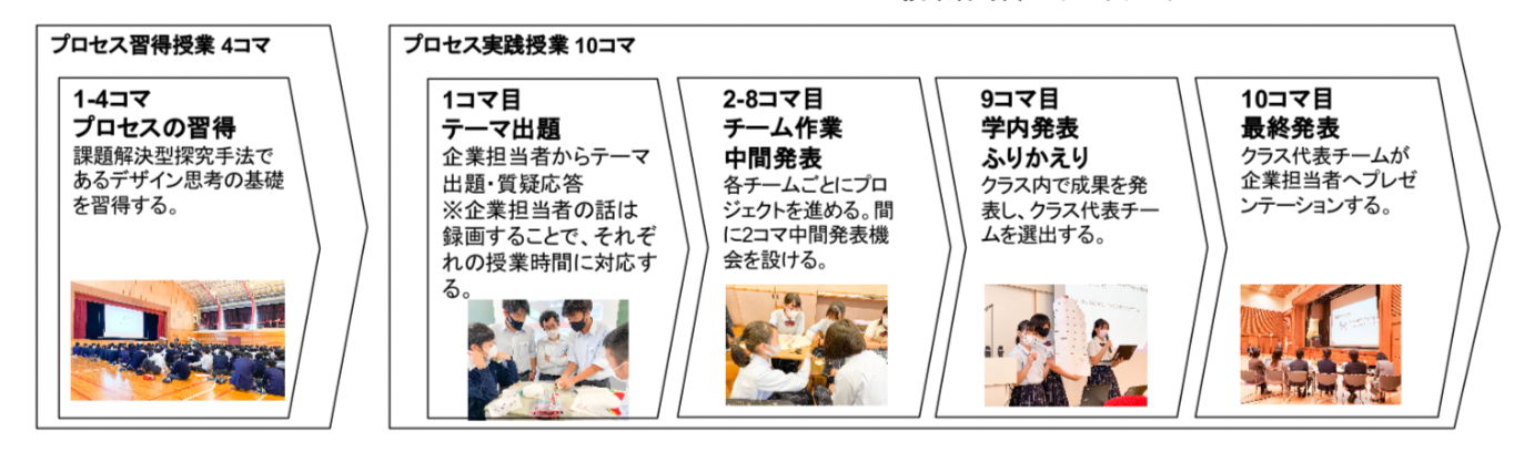 企業・団体等から出題される実社会の諸課題を切り取ったテーマに取り組むことや、その過程で基礎的な探究プロセスを習得することを通して、社会課題解決への経験と自信を得ることを目的とした探究授業を実施します。