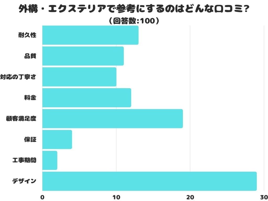 ・デザインや価格は外構やエクステリアによって異なると思うので私でしたら品質を1番に参考にします。人の手によって作られるものだと思うので技術も含め品質を参考にしたいです。(女性20代)