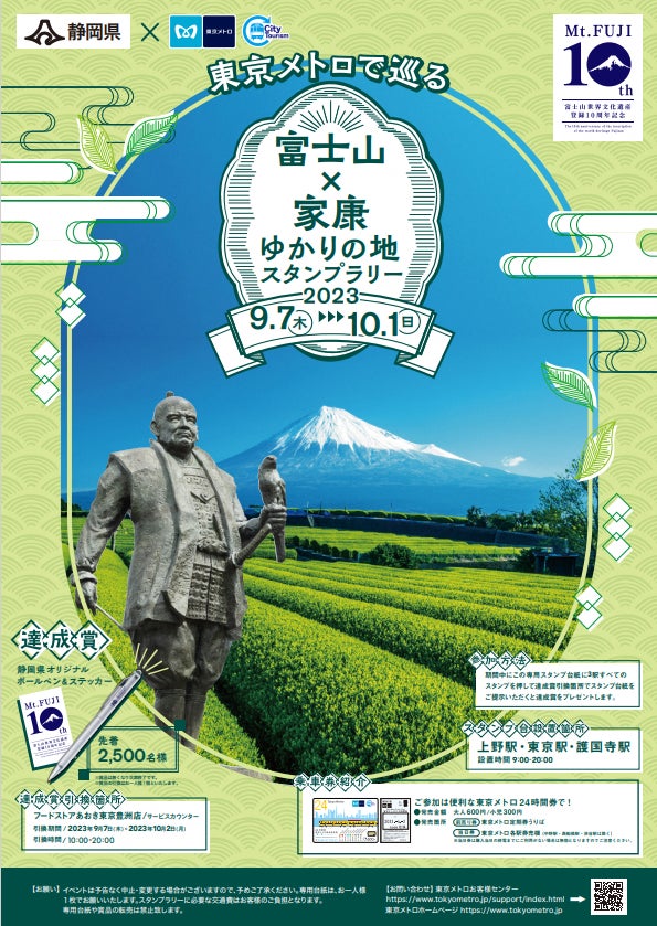 スタンプラリーでは、東京メトロ沿線で、富士山と家康のゆかりの地を3か所紹介し、それぞれの最寄り駅に設置されたスタンプを全て集めて達成賞引換場所に提示すると、先着2,500名様に「富士山世界文化遺産登録10周年記念オリジナルボールペン&ステッカー」をプレゼントします。