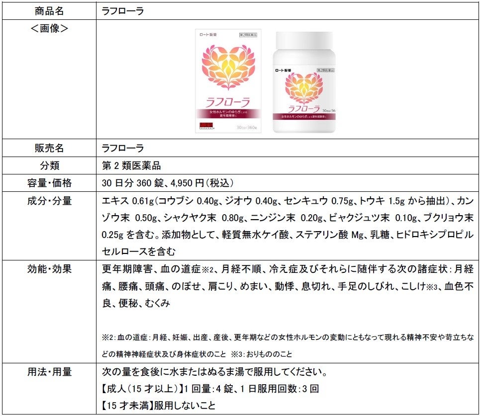ロート製薬株式会社(本社:大阪市、社長:杉本雅史)は、更年期女性のための医薬品「ラフローラ」を2023年9月5日(火)にロート通販にて発売いたします。女性の社会進出が進み、働き方も多様に、さまざまな領域で活躍する方が増える今、女性ホルモンの乱れに伴う更年期障害などの悩みを抱える方に向けた商品のご提案です。今後も各世代による悩みに向き合い、一人ひとりのウェルビーイングを叶えていきます。