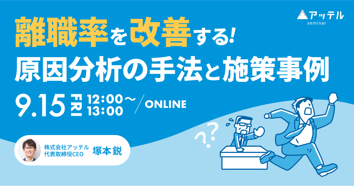 締役:塚本 鋭)は、人事ご担当者向けの無料オンラインセミナー『離職率を改善する、原因分析の手法と施策事例』を2023年9月15日(金)に開催いたします。