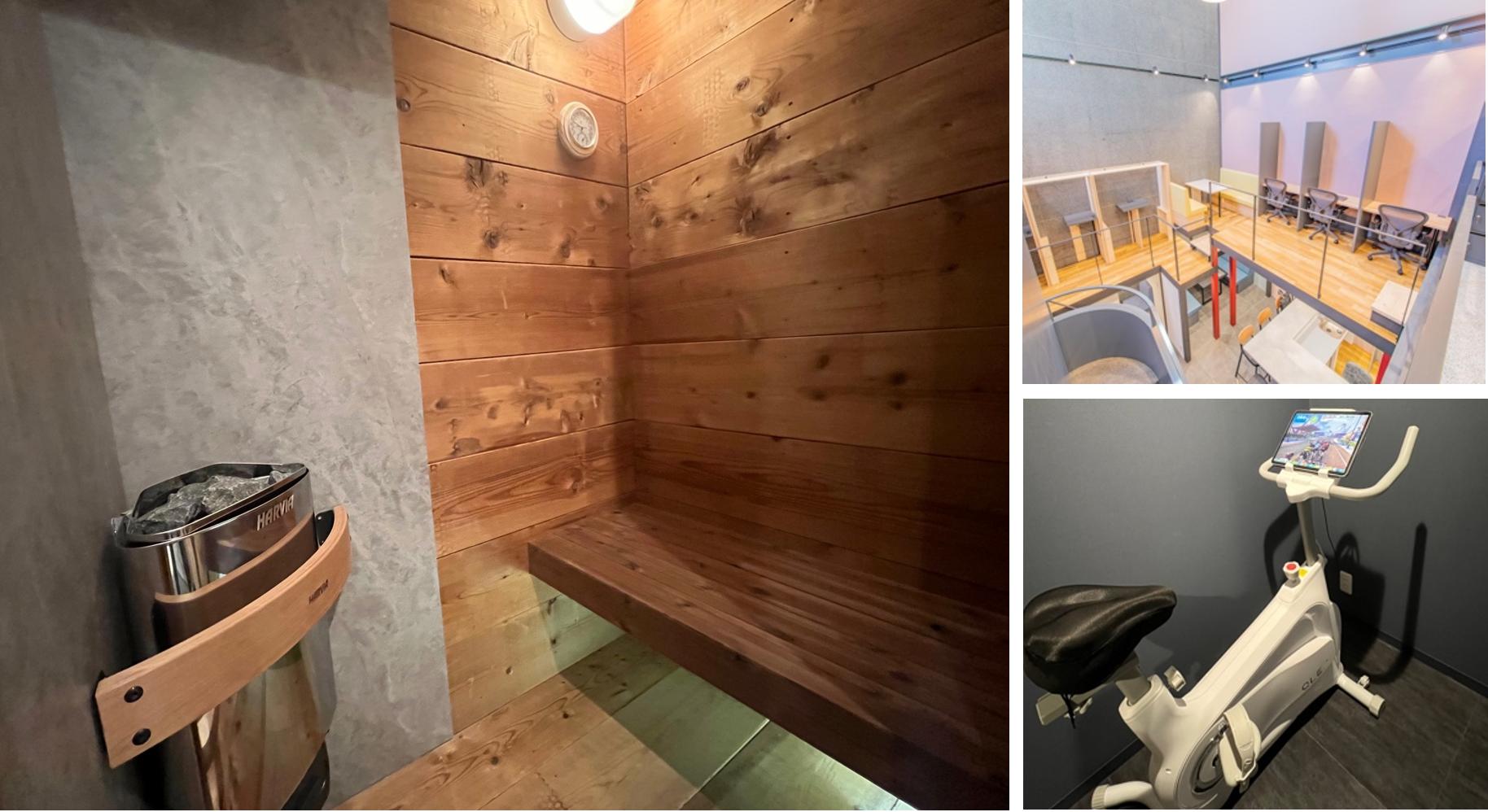 地下1階はリラグゼーションスペース。ロウリュも可能なフィンランドHARVIA製のプライベートサウナ2室(水風呂可浴室付き)、エアロバイク1台、仮眠スペース1室を擁します。疲れた体や脳を整え、心身ともにリフレッシュした状態でお仕事に取り組んでいただけます。