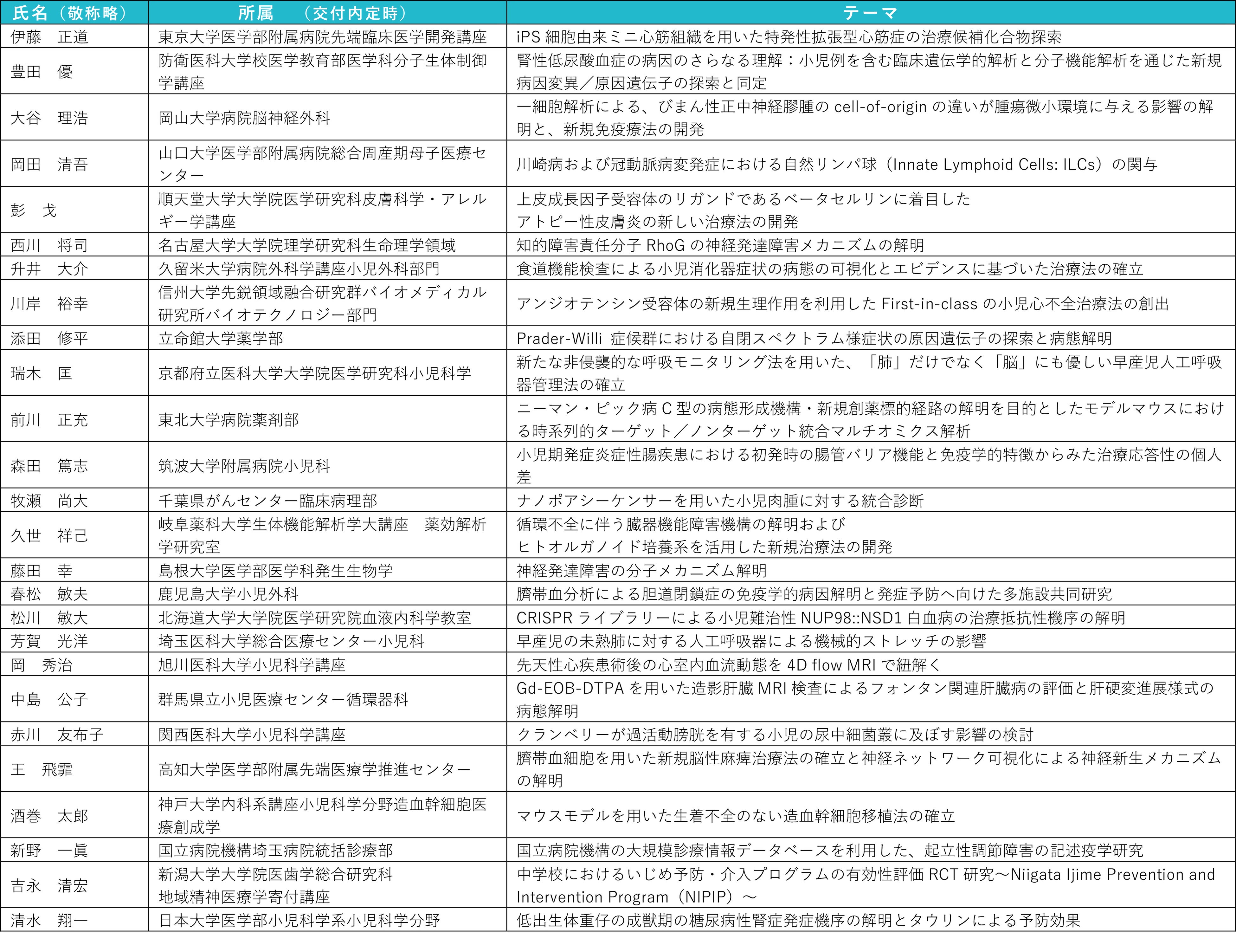 (1)日本国内の総合大学医学部、医科大学、医学研究機関、医療機関等で小児医学研究に従事していること