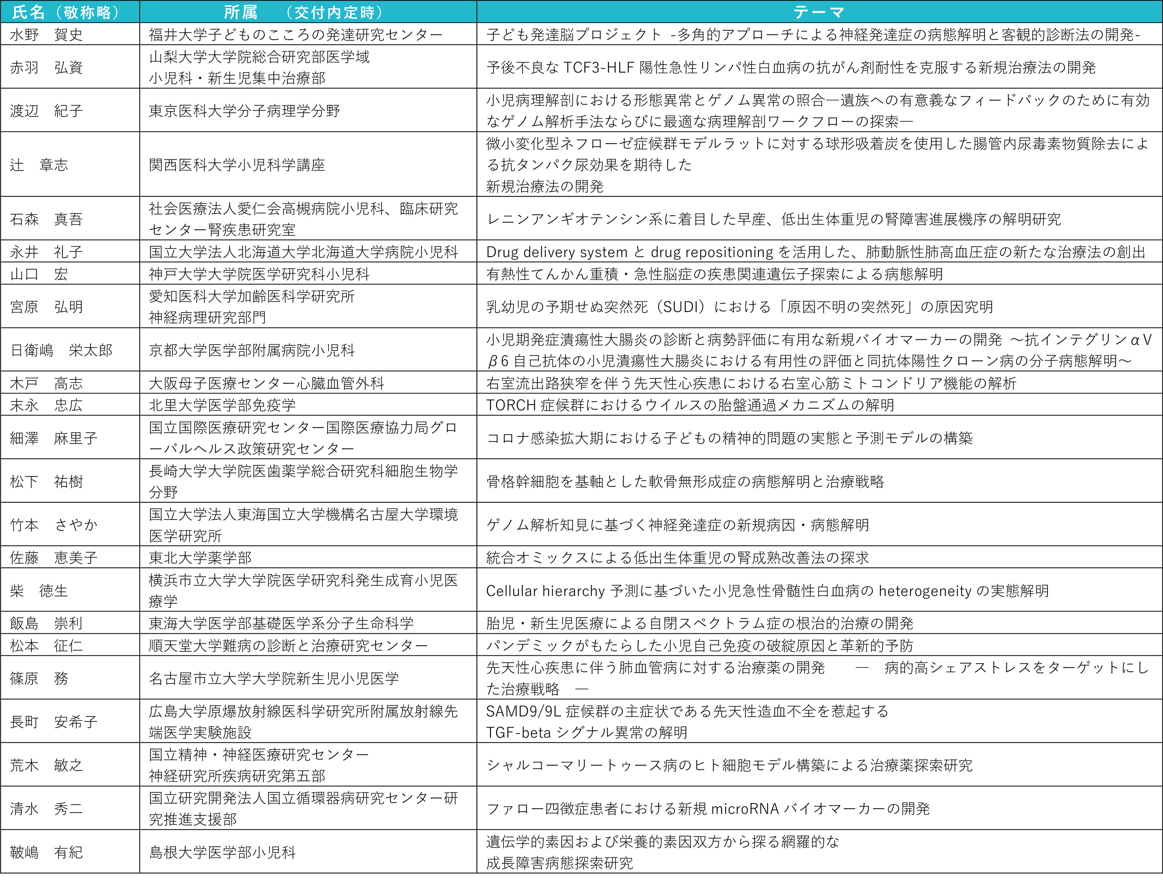 小児医学・医療の進歩と共に救われる命は増え、子どもたちの健康は確実に守られてきています。しかし、解決すべき問題はまだたくさんあります。当財団では、小児疾患の原因究明・治療・予防などに関する研究の発展を支援するため、1990年から小児医学研究者に対して助成金の交付を行っています。2007年には、若手研究者の活躍を後押しするために 40 歳以下の研究者を対象とする若手枠も設けました。一般枠は一人 300 万円、若手枠は一人 100 万円を上限として、助成金を交付しています。