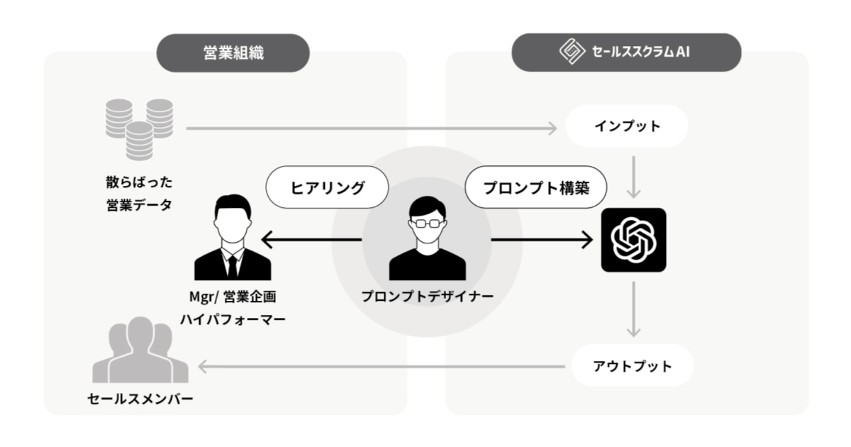一方で、生成AIは利用方法の自由度が高いため、組織的に利用するためには、適切なデザインが必要です。セールススクラムAIは、プロダクトとともに導入設計と支援を行うプロンプトデザイナーとともに営業活動における生成AI活用課題に対応し、営業プロセスを効果的にサポートします。