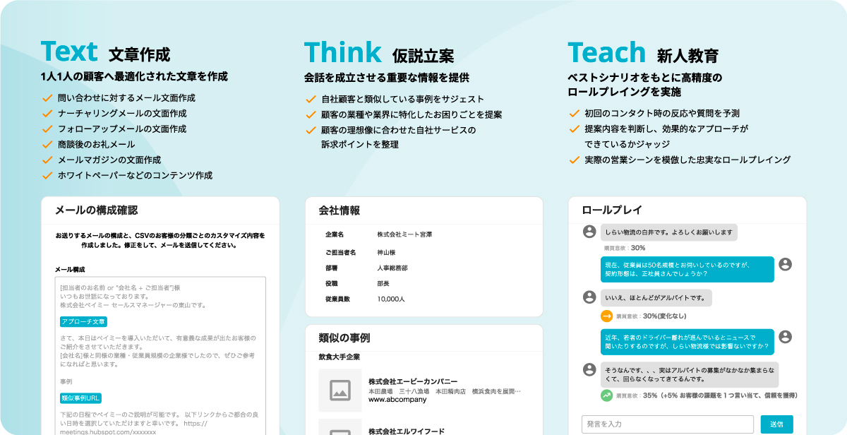 生成AIは、大量のデータを学習し、学習に基づいた新しい情報や文章を生成する革新的な技術です。「セールススクラムAI」ではこのテクノロジーを活用し、営業活動に特化したUI/UXでサービスをご提供いたします。これにより、公開情報はもちろん、過去の行動や購買履歴に鑑みた顧客の状態やニーズに関する洞察を踏まえた文章作成、仮説立案、新人教育などが容易になります。