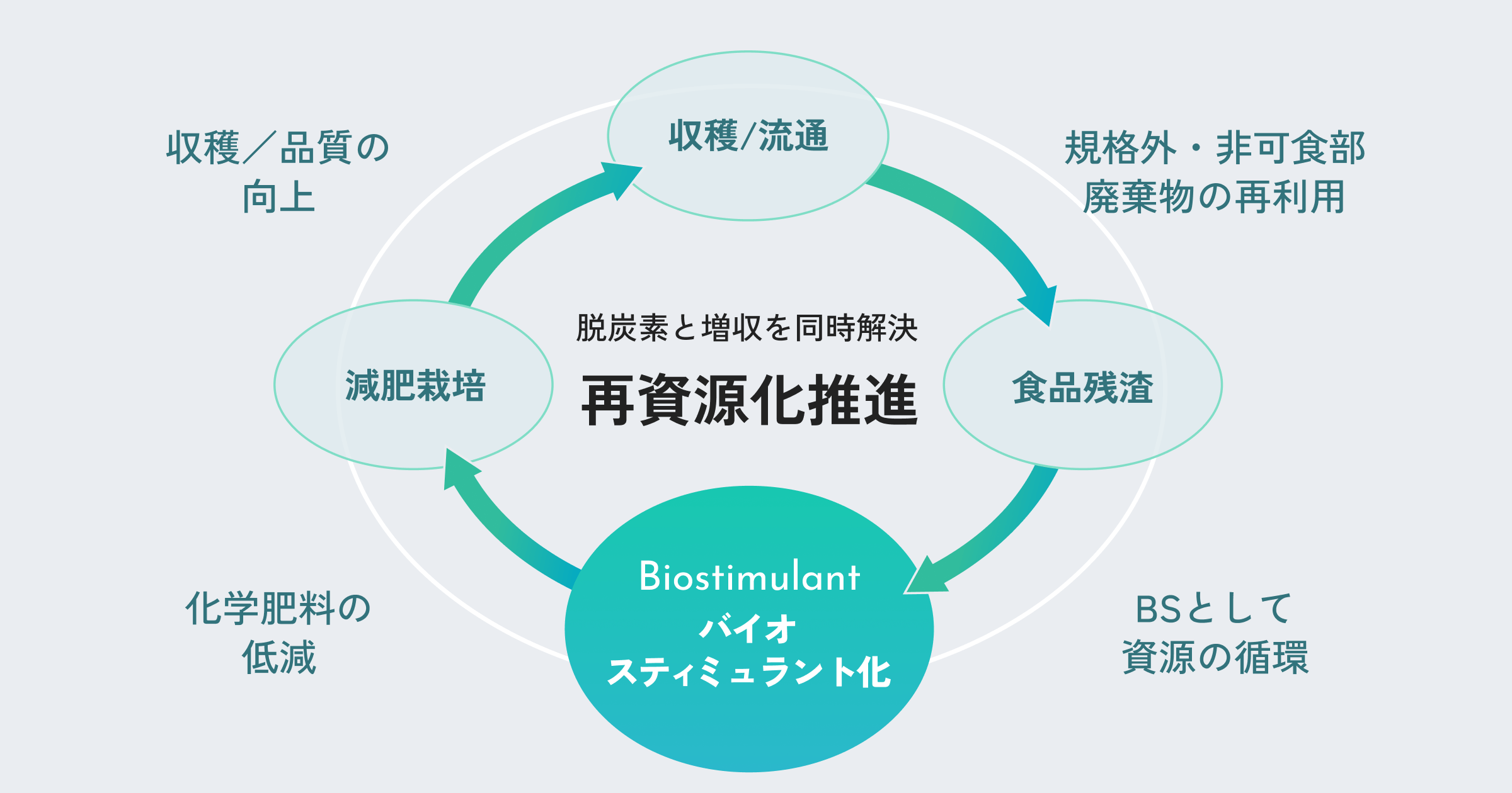 AGRI SMILEが開発した食品残渣型バイオスティミュラントは、「食品」から「食品」を作り出していく、資源循環を実現します。地域の食品残渣をバイオスティミュラントに変えることで、再資源化・化学肥料低減・気候変動にも強い作物を生産し、環境にやさしい持続的なフードサプライチェーンの循環を生み出します。