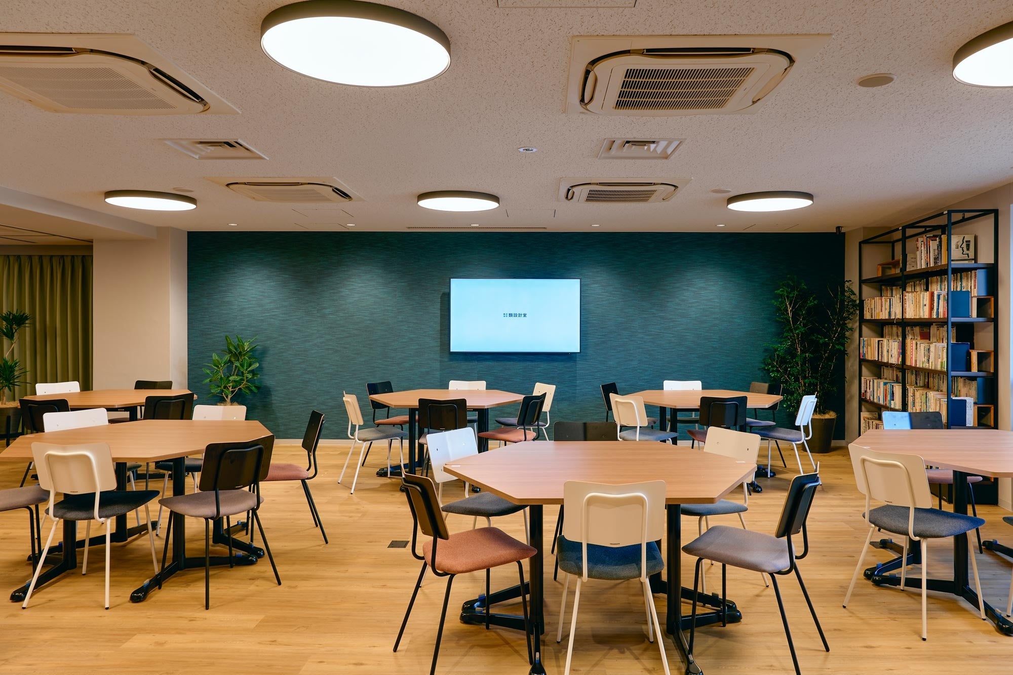 来訪者の方をお招きするエントランスに隣接して、少人数での打ち合わせから最大100人規模のイベントに対応したスペースです。活動内容にあわせ家具什器を柔軟にレイアウト変更できるとともに、参加者同士の活発な議論を促す開放的なインテリアとしています。