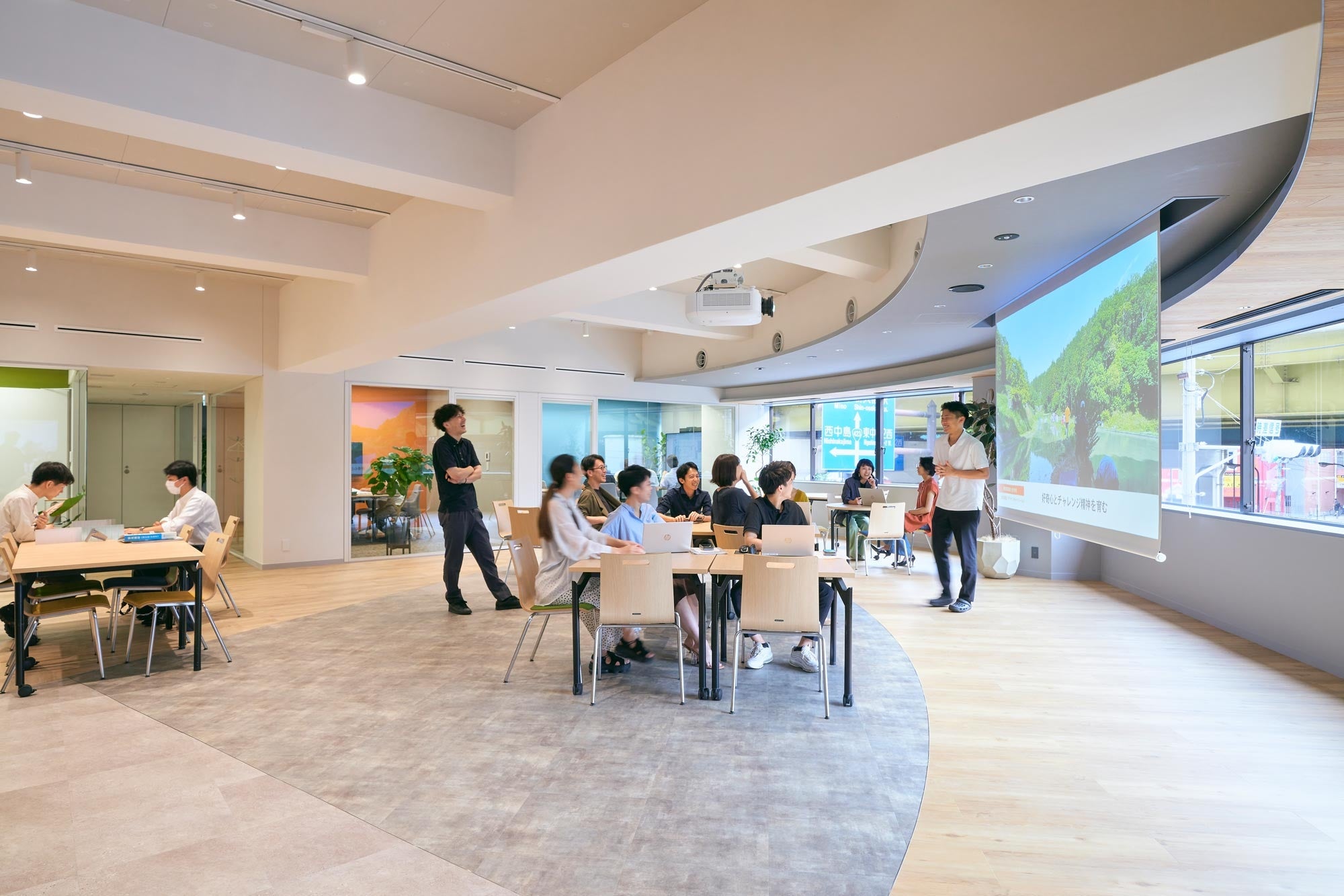 小1~高3の子どもたちを対象とした全日制の学び舎「類学舎」。異学年での交流・学び合いを活発化するオープンな教室空間とし、共用部のオープンスペースは社員・社外の方などと共創・協働して学べる場としています。これまでにも、52件150人の企業・教育機関などの見学、計13社と連携した企業インターンも開催しています。2013年からスタートした共同保育制度の共同保育室もこのフロアにあります。