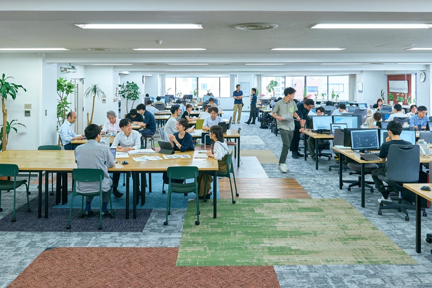 全事業部の社員が働く5階と6階のエリア。いずれも、その階すべてを使用した広々としたワンフロア空間で、壁や柱がないオープンなオフィスです。室内の中央には打ち合わせスペースを配置し、事業部を超えた連携を活性化させ、新事業の創出を促進します。社内で進行している多くのプロジェクトの追求風景が見渡せ、活力ある雰囲気をつくり出します。