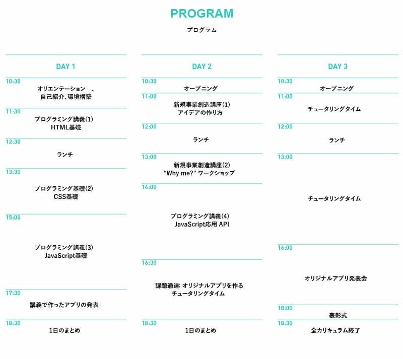 ・プログラミングの基礎だけでなく、実際のオリジナルアプリを作り出す3日間の集中講座です。